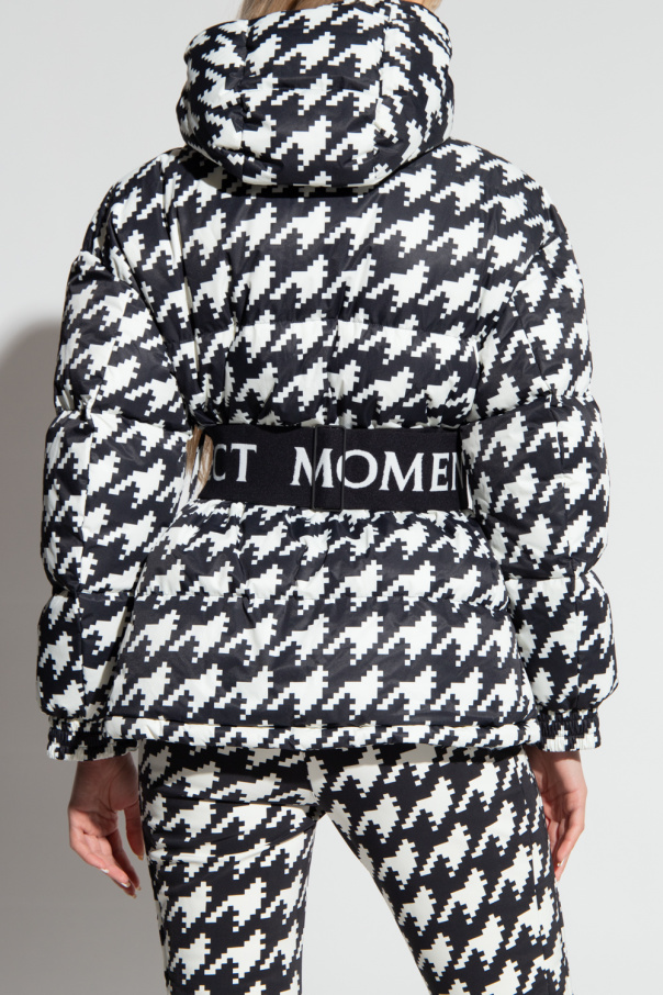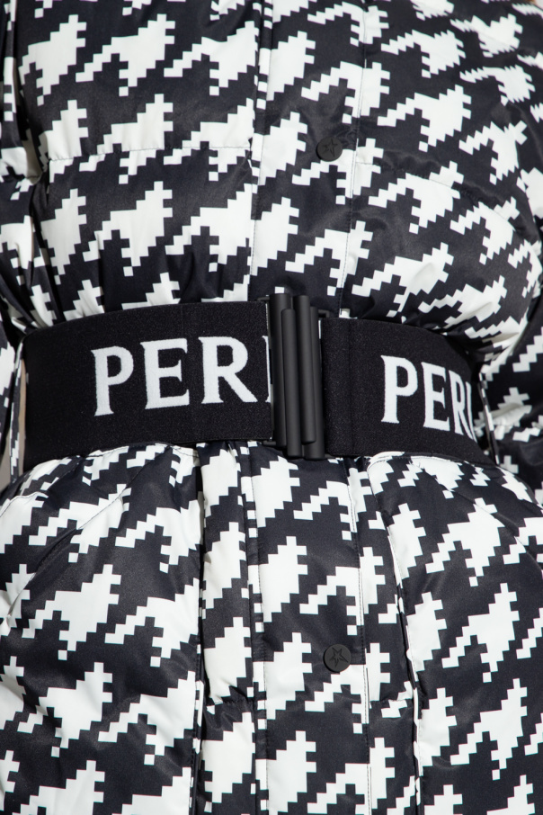 White and black oversize parka from Perfect Moment. Made of waterproof materials padded with down from sustainable sources, this garment is complete with zip and snap fastenings, red logo embroidery, waist belt, two zip pockets and long sleeves with adjustable snap fastenings.