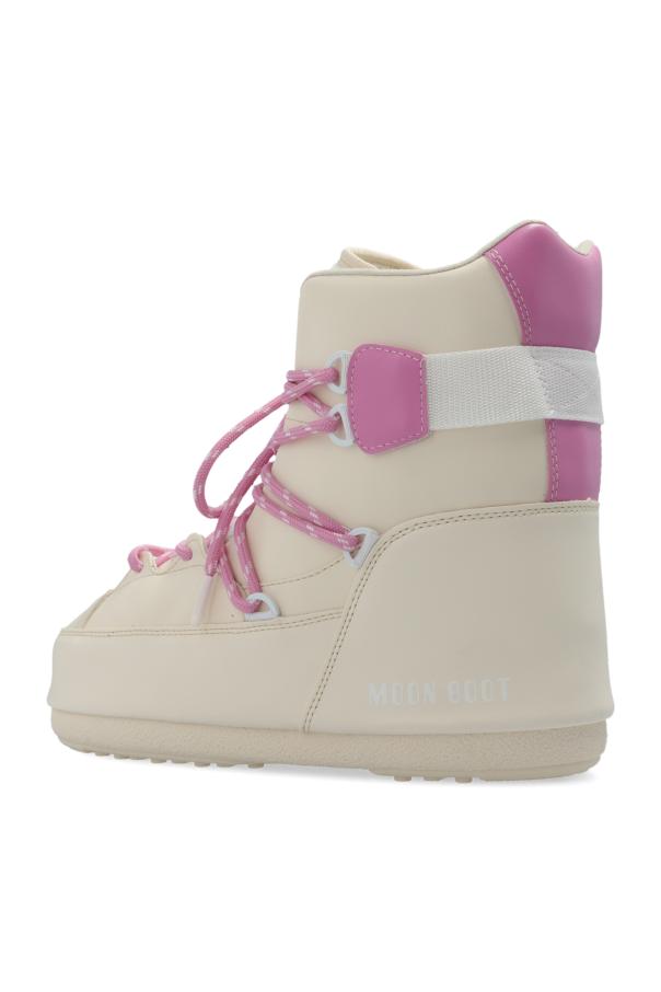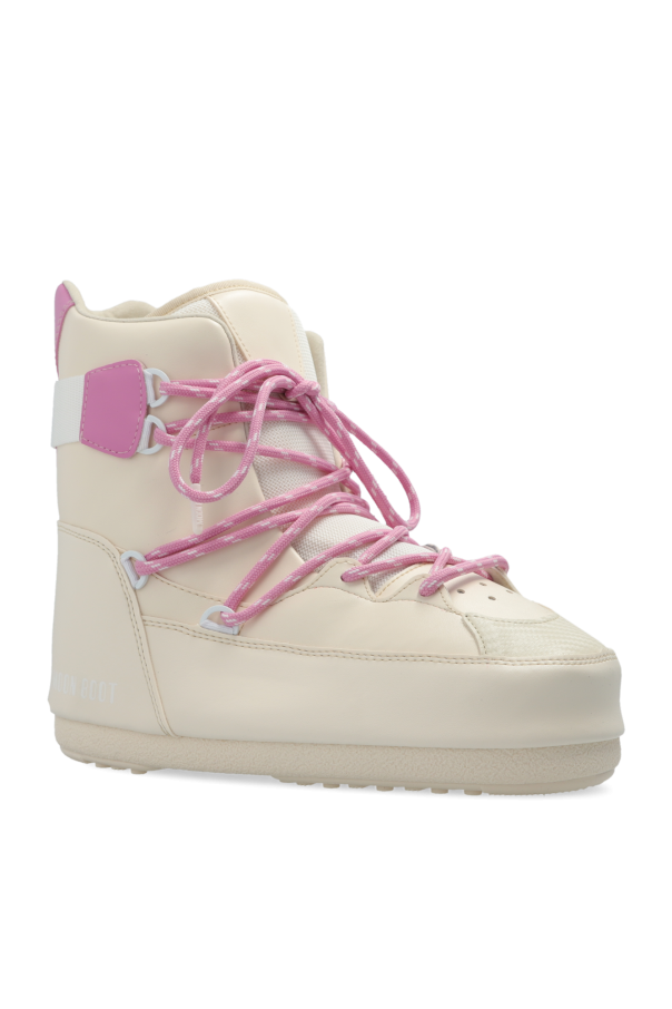 Cream and pink ‘Sneaker Mid’ snow boots from Moon Boot. Made of waterproof material, this lace-up model sits on a cream tread rubber sole with suction cups to ensure superb grip on any surface and showcases a perforated front and a printed logo. This model is inspired by basketball style, while its oversized, insulated silhouette is reminiscent of the original 1969 design.