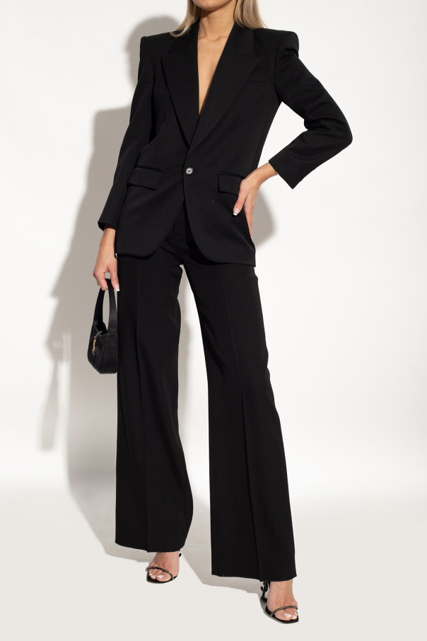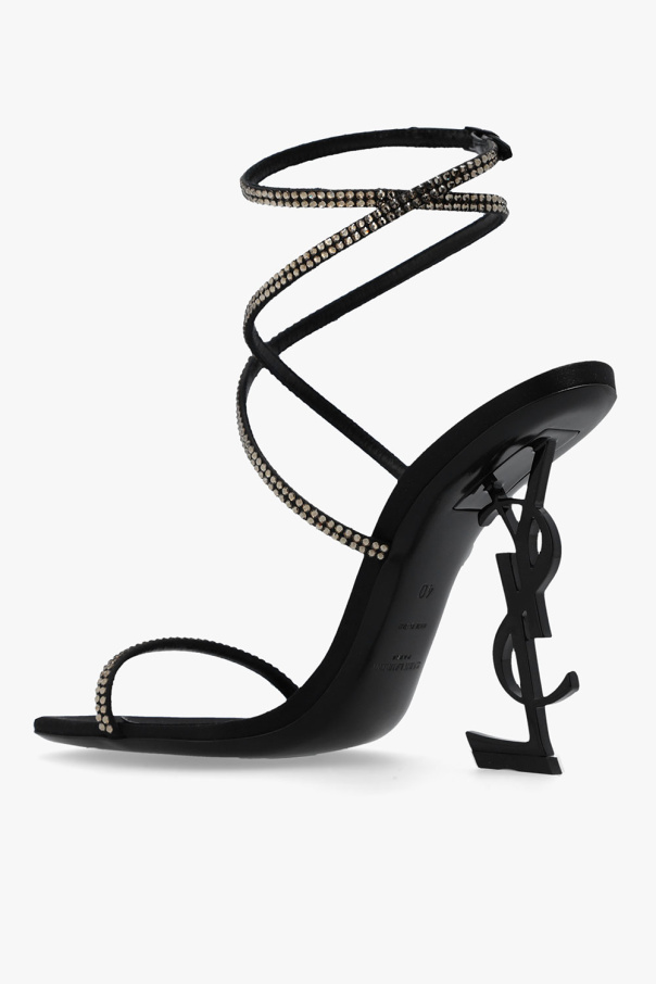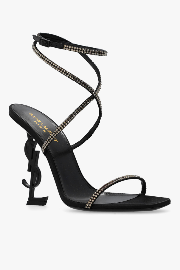 Black ‘Opyum’ heeled sandals from Saint Laurent. Made of silk, this pair features an adjustable buckled ankle strap, crystals, decorative logo-shaped heel and black leather sole.