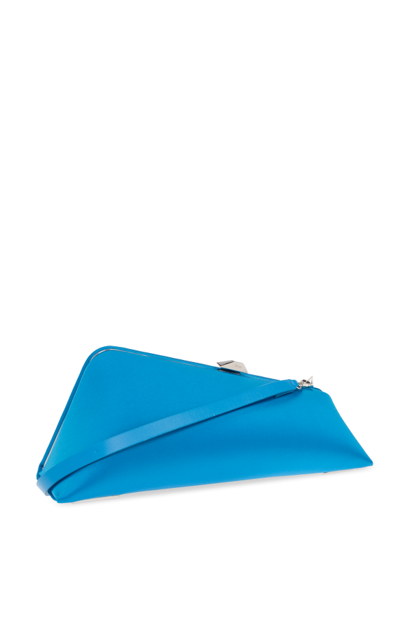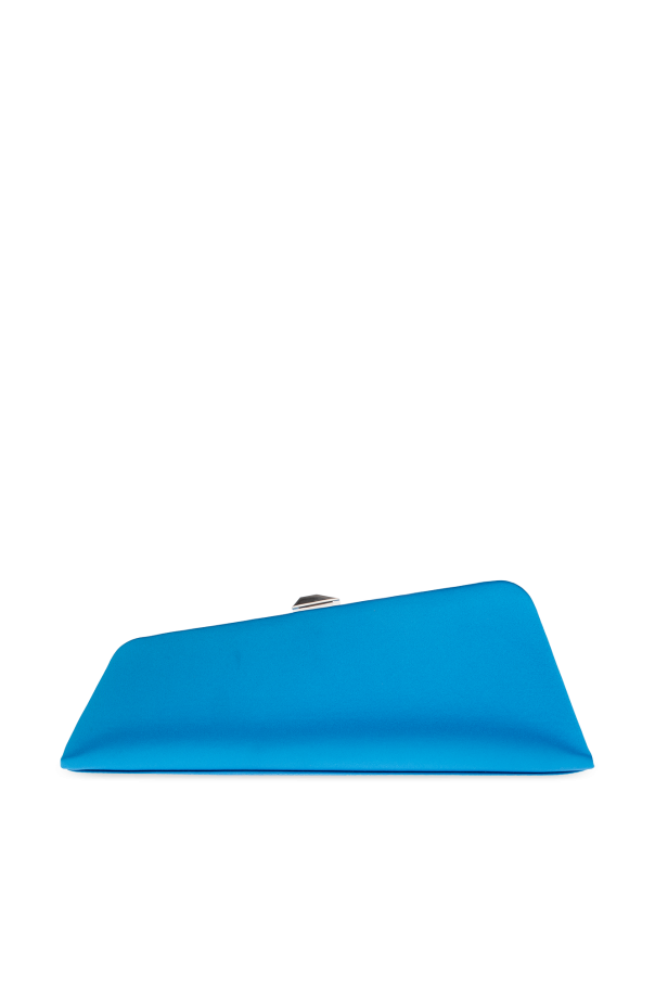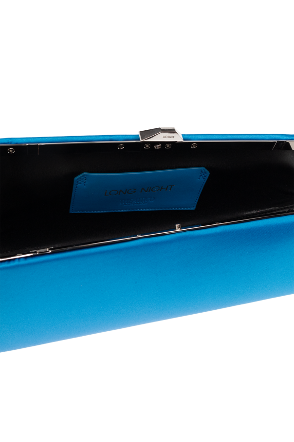 Blue ‘Long Night’ clutch from The Attico. Made of satin, this design features a snap closure, logo print, detachable strap in calf leather, silver-tone metal hardware and one internal compartment with one card slot.