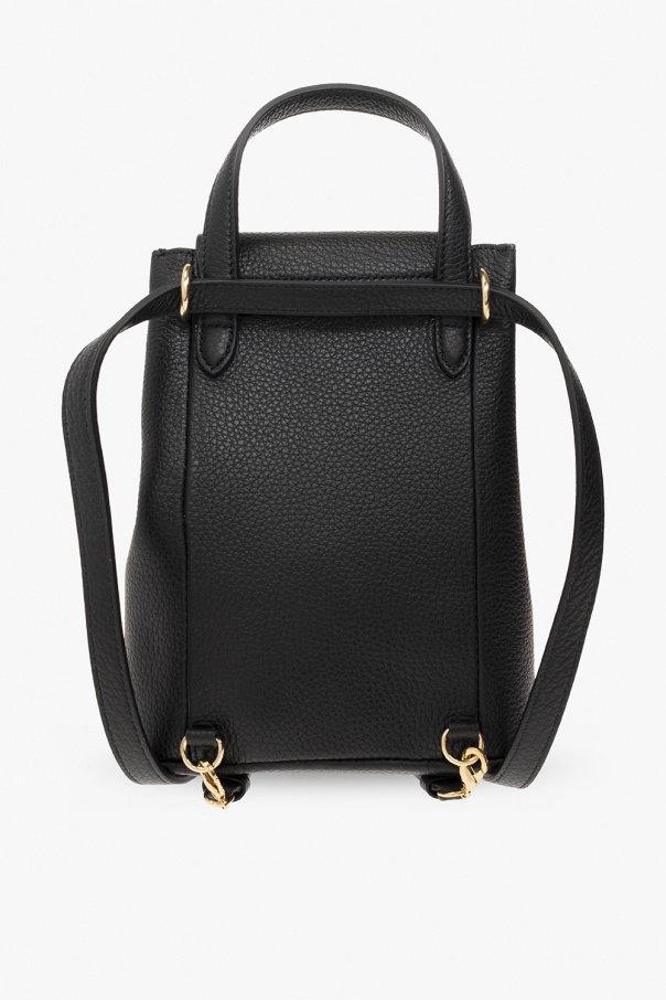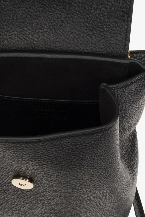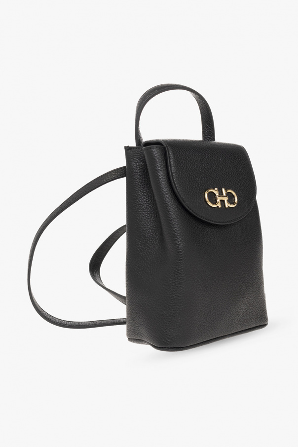 Black ‘Gancini Mini’ backpack from FERRAGAMO. Crafted from calf leather, this design secures with a magnetic snap and showcases a ‘Gancini’ application on the front, a half-round handle, a detachable strap, gold-tone metal hardware and one internal compartment with a card slot. Item can be worn as a shoulder bag.