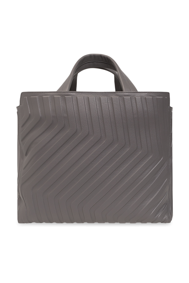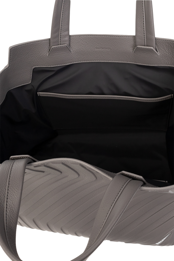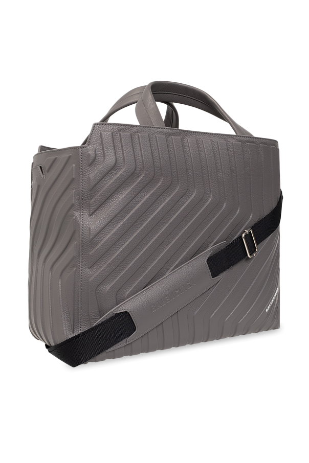 Dark grey ‘Car Medium East-West’ shopper bag from Balenciaga. Crafted from grainy calf leather, this design showcases an embossed car tire pattern. It is complete with a white logo print on the front, two half-round handles, a detachable and adjustable shoulder strap, silver-tone metal hardware and one internal compartment with two slip pockets.