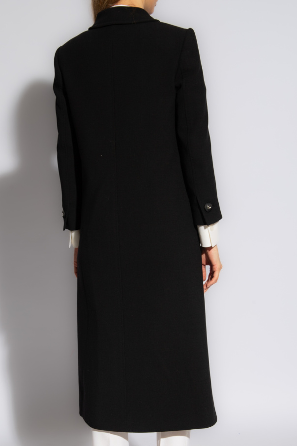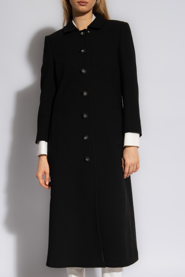 Black coat from Dolce & Gabbana. Made from wool, this style fastens via silver-tone logo buttons and features a classic collar, two frontal pockets, long sleeves and a beige, brown and black lining decorated with an animal motif.