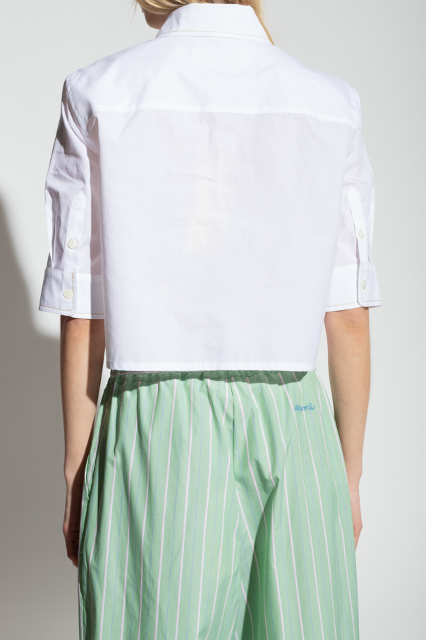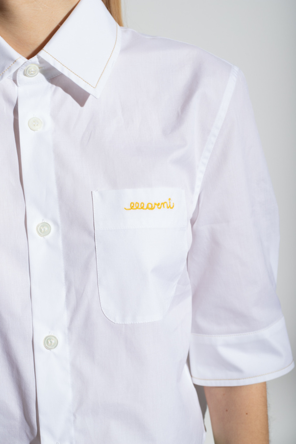 White shirt from Marni. Crafted from organic cotton with a cropped, relaxed fit, this style features button fastenings, a slip chest pocket embroidered with a yellow logo and short sleeves with button cuffs.