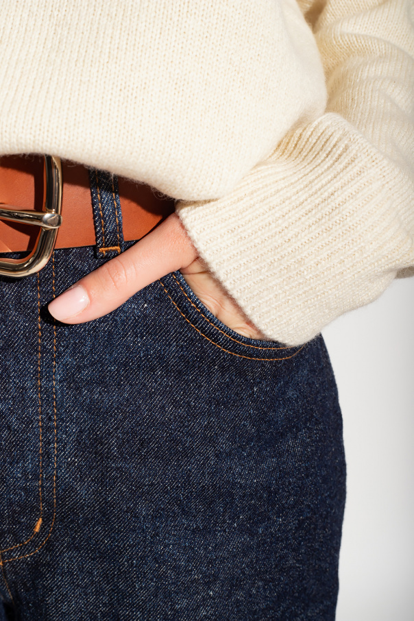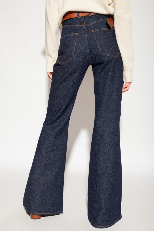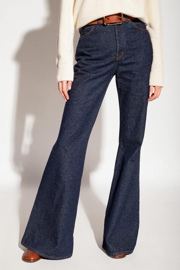 Navy jeans from Chloé. Fastened with a zip and button, this flared pair features a logo embroidery, beige stitching details, four front pockets, including one with a buttoned flap, and two back pockets.