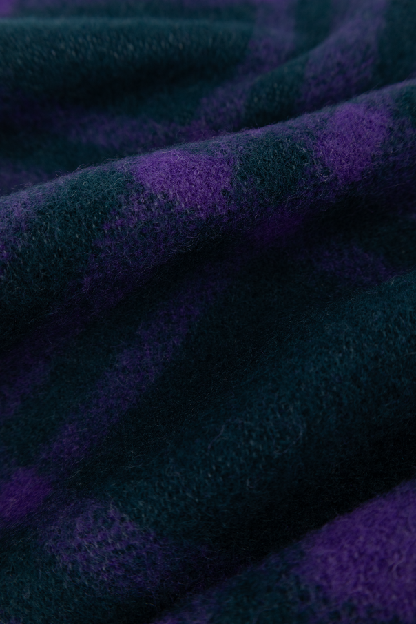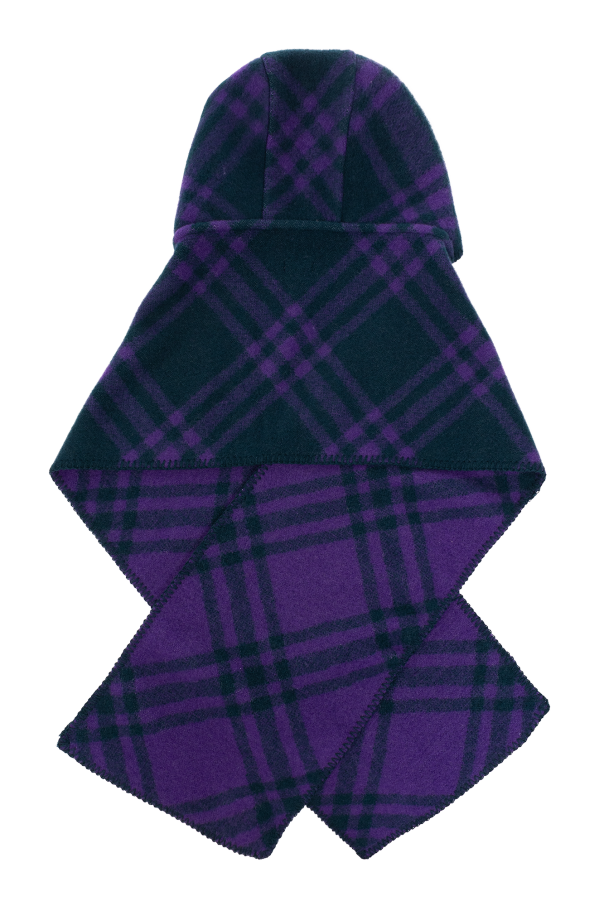 Navy blue and purple scarf with a hood from Burberry. Made from wool, this item showcases a logo patch and the brand's signature check pattern.