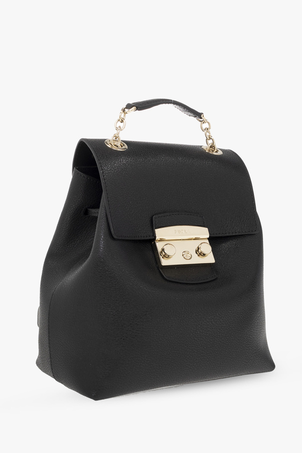 Black ‘Metropolis Small’ backpack from Furla. Crafted from leather, this design features a flap with a logo-engraved metal snap closure, a half-round handle, adjustable shoulder straps with a chain trim, gold-tone metal hardware and a drawstring interior with a zip pocket inside.