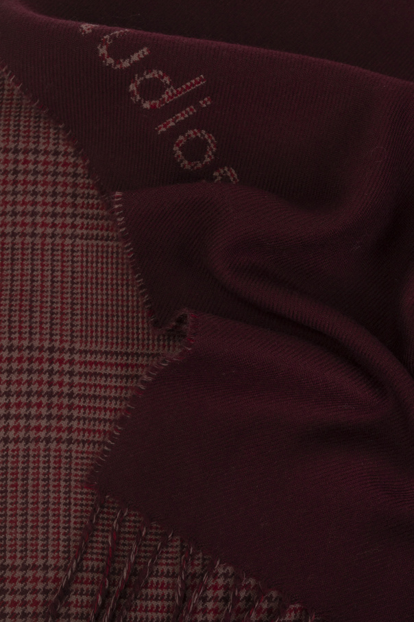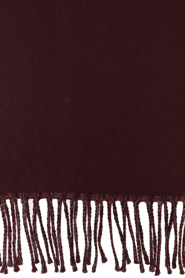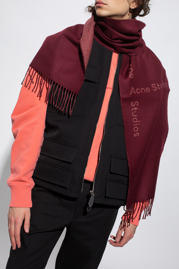 Maroon scarf from Acne Studios. Made of wool, this item features fringed edges and a check pattern accompanied by the brand's logo.