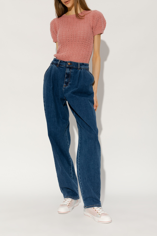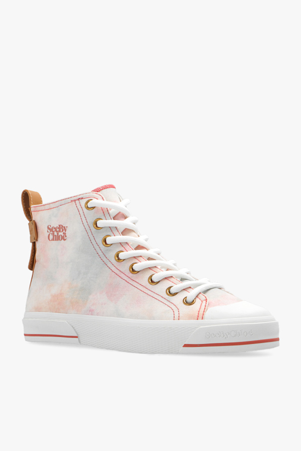 Blush pink 'Aryana' sneakers from See By Chloé. Enriched by a pink graphic print with the brand's logo, this lace-up model features a high-top silhouette, a beige leather strap with an embossed logo at the back and a white and pink rubber sole at the base.