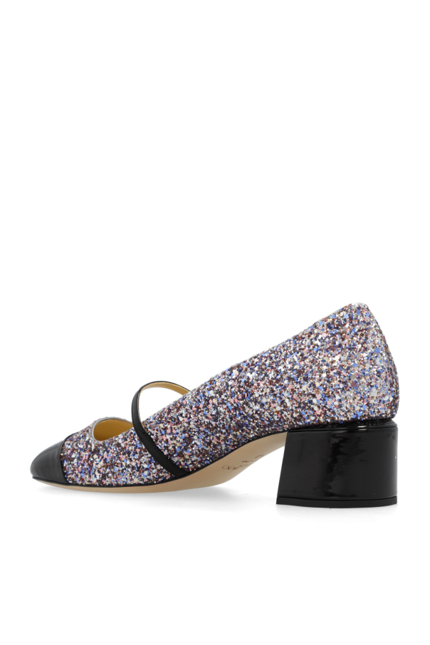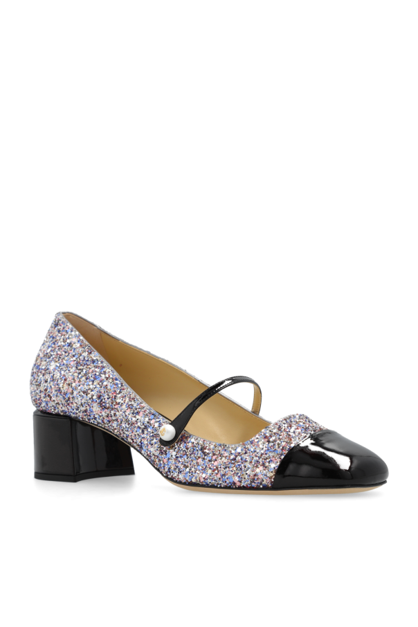 Silver-tone, pink and blue ‘Elisa’ pumps from Jimmy Choo. Made of fabric embellished with glitter with black patent leather trims, this pair features a strap with a pearly button and a logo, round toe, block heel with an engraved logo and a beige leather sole.