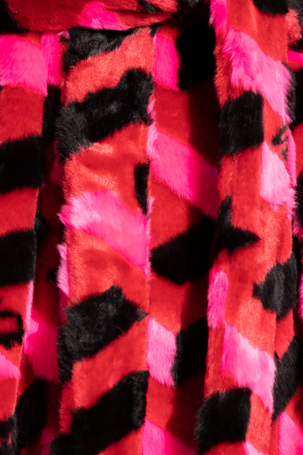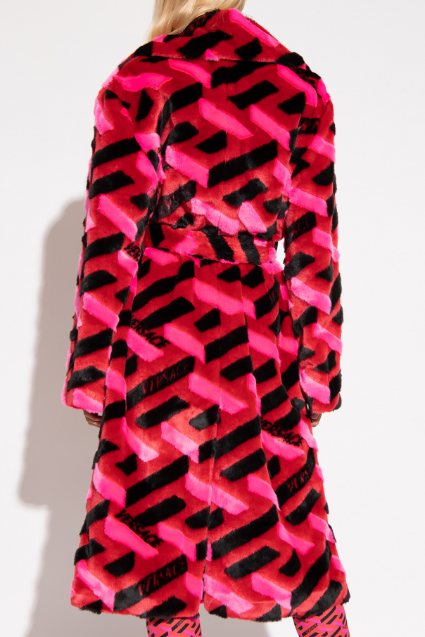 Red, pink and black coat from Versace. Made of faux fur with the La Greca pattern, this design features a waist belt, peak lapels, two slip pockets, long sleeves and lamb leather trims in black.