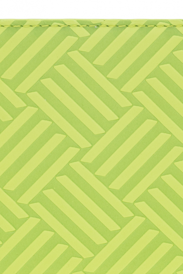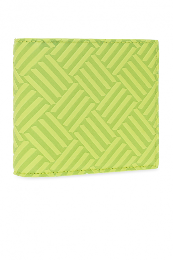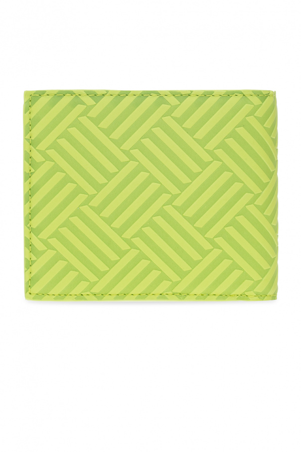 Light green bi-fold wallet from Bottega Veneta. Crafted rubberised material embossed with the brand's signature ‘Intreccio’ weave, this design features two bill compartments, four card slots, two slip pockets and one snap-fastened pocket.