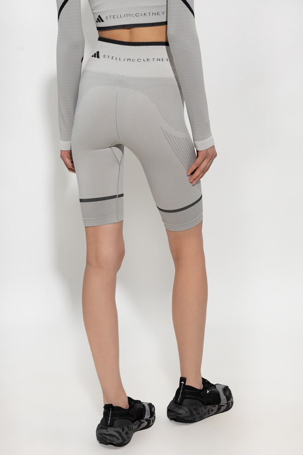 Short, grey and black leggings from ADIDAS by Stella McCartney. Made in part from recycled materials, this pair features an elastic waistband, ribbed, partially seamless design and logo embroidery at the back.