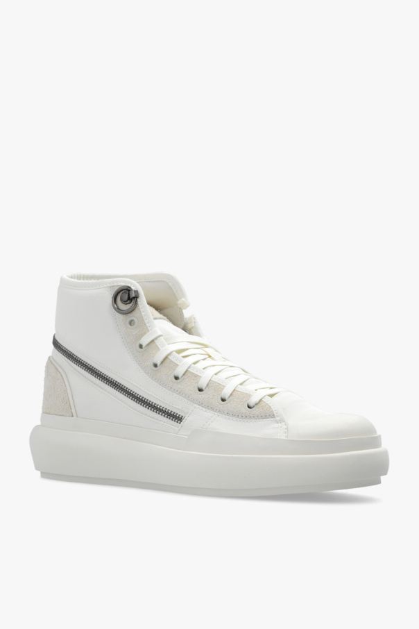 Cream ‘Ajatu Court High’ sneakers from Y-3 Yohji Yamamoto. Crafted from leather and fabric with a high-top silhouette, this lace-up model sits on a cream rubber sole and features a branded tongue and a back zipper.