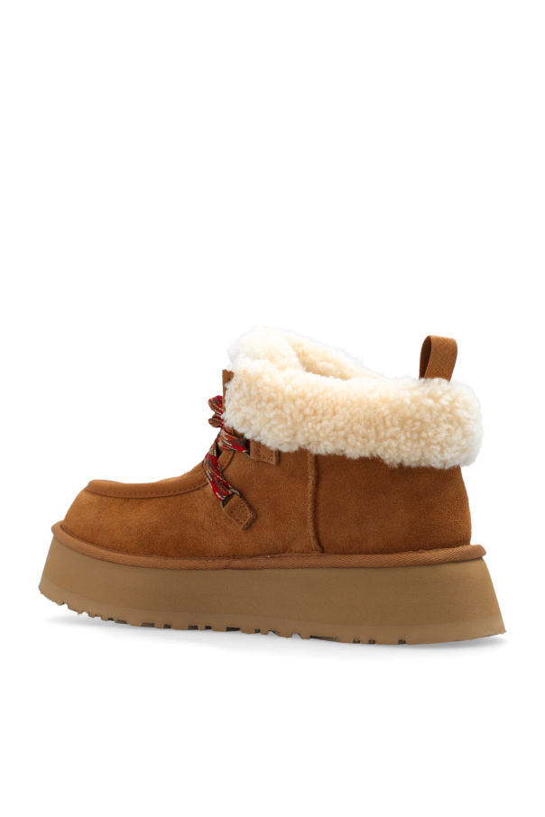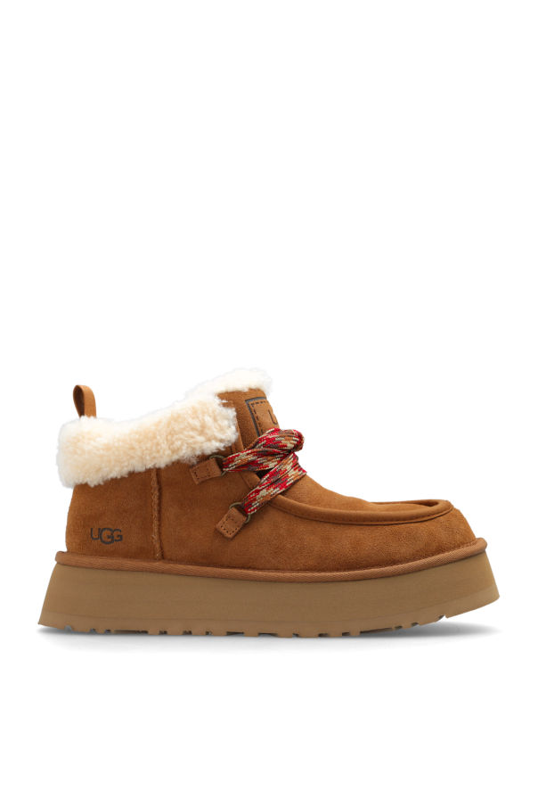 Brown ‘Funkarra Cabin’ ankle boots from UGG. Made of suede and lined with cream UGGPlush™, this lace-up model sits on a beige rubber sole and showcases the brand's logo.