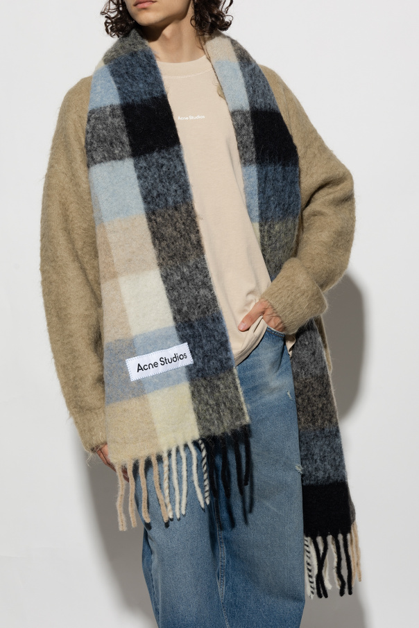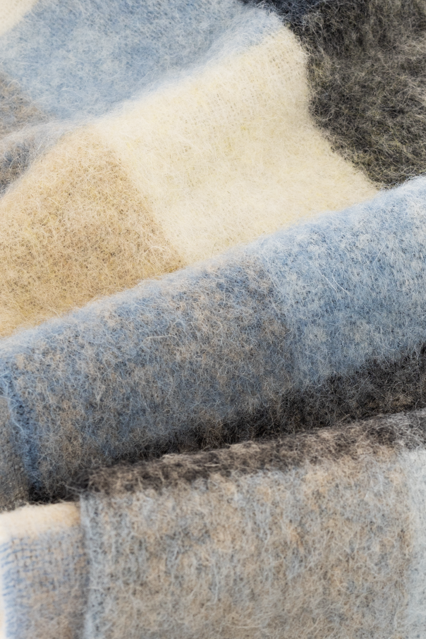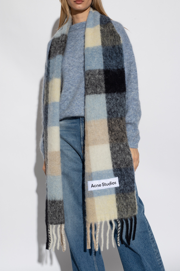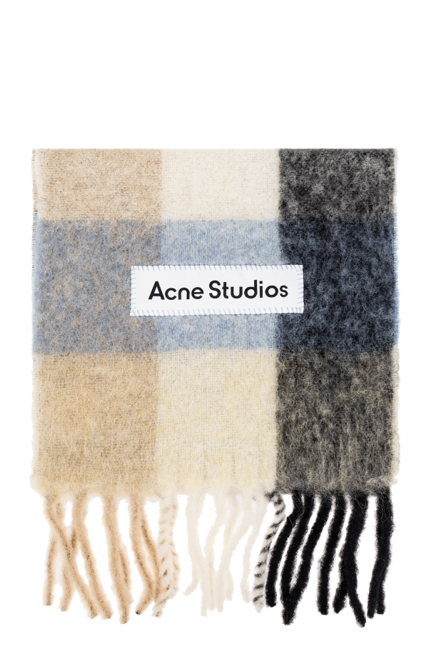 Blue, beige and black scarf from Acne Studios. Crafted from a blend of sheep wool, alpaca and mohair, this item features a check pattern, fringe detailing and a logo patch.