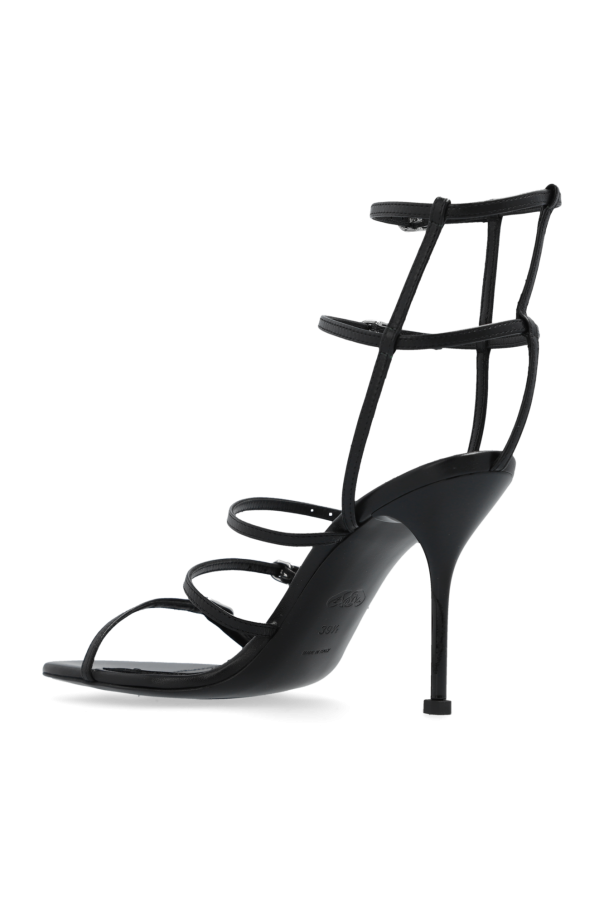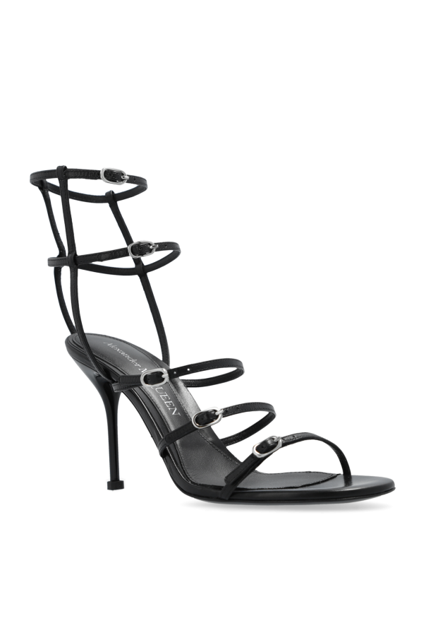 Black heeled sandals from Alexander McQueen. Made of smooth leather, this pair features adjustable buckle straps, a rounded toe and black leather sole.