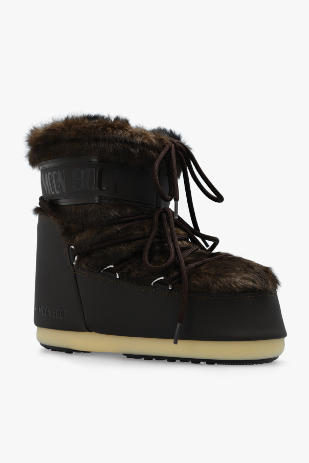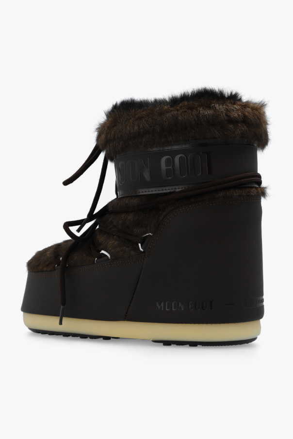 Dark brown ‘Icon Low’ insulated snow boots from Moon Boot. Crafted from water-repellent ProTECHt material and trimmed with faux fur, this lace-up model showcases the brand's logo, a lightweight midsole and suction pads on the rubber tread sole in black and cream that offer serious ground control. Inspired by the footwear worn by astronauts during the 1969 lunar landing, this project combines technical features with a contemporary look.