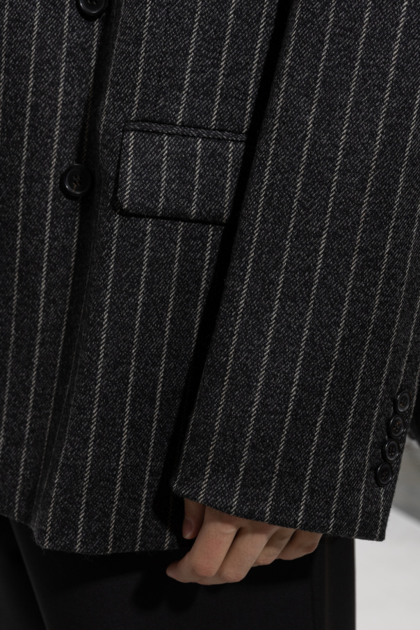 Black and white double-breasted blazer from Acne Studios. Made of wool, this garment has button fastenings, peak lapels, stripe pattern, three pockets, double rear vent and long sleeves.
