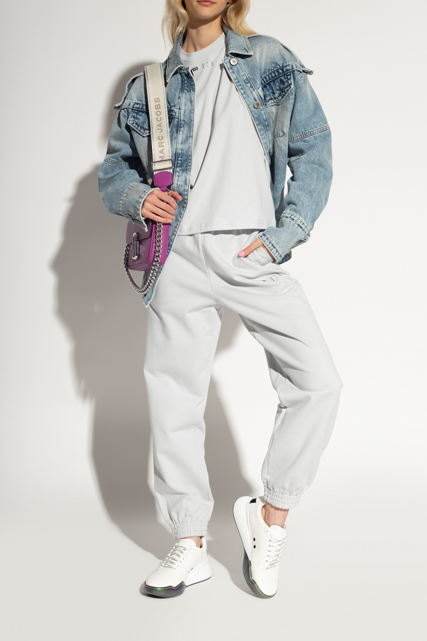 White ‘Loop’ sneakers from Stella McCartney. Made of faux leather, this lace-up pair features a holographic logo pattern and multicolored rubber sole.