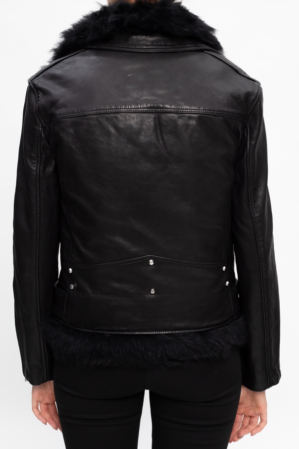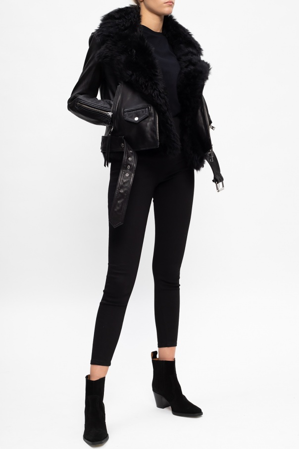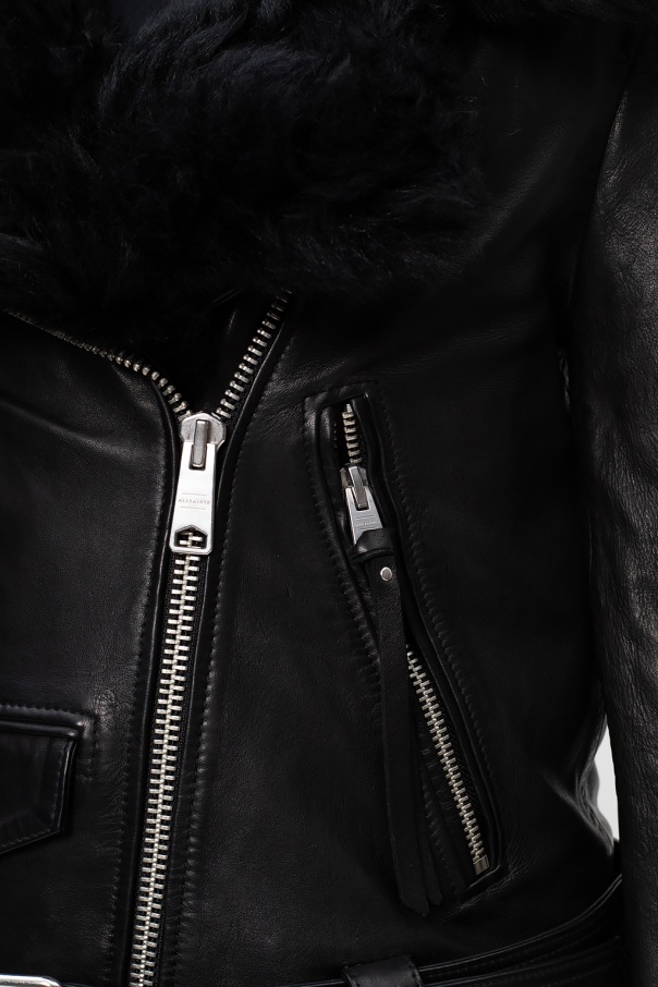 Black ‘Luna’ biker jacket from AllSaints. Crafted from sheep leather, this garment features a zip fastening, adjustable belt, two zip pockets, one snap-fastened flap pocket and a detachable vest lined with shearling.
