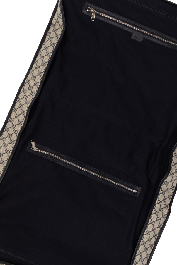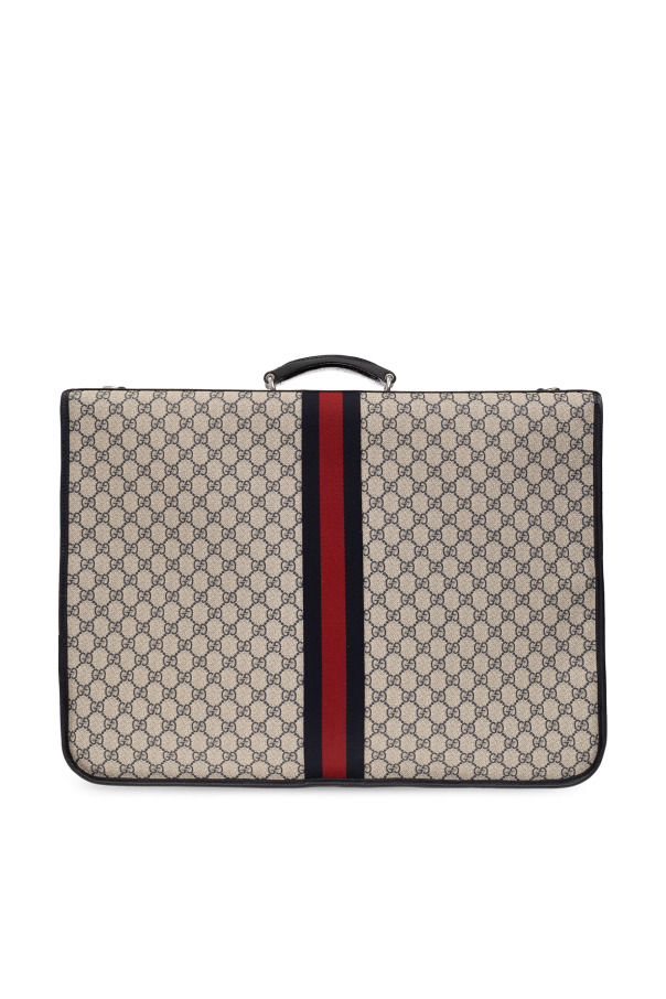 Cream and navy blue garment bag from Gucci. Crafted from ‘GG Supreme’ canvas and trimmed with calf leather, this design secures with two lobster clasps on the sides and showcases the brand's signature navy blue and red ‘Web’ stripe. It is complete with a ‘Double G’ application and one zip pocket on the front, one short handle and detachable and adjustable shoulder strap, silver-tone metal hardware, one ID tag, one key holder with a concealed padlock and one zipped compartment with hanger and two zip pockets inside.