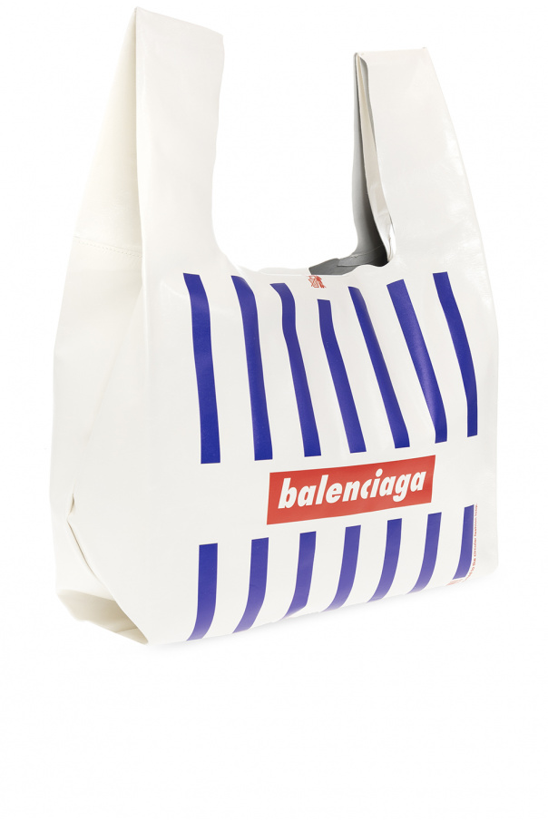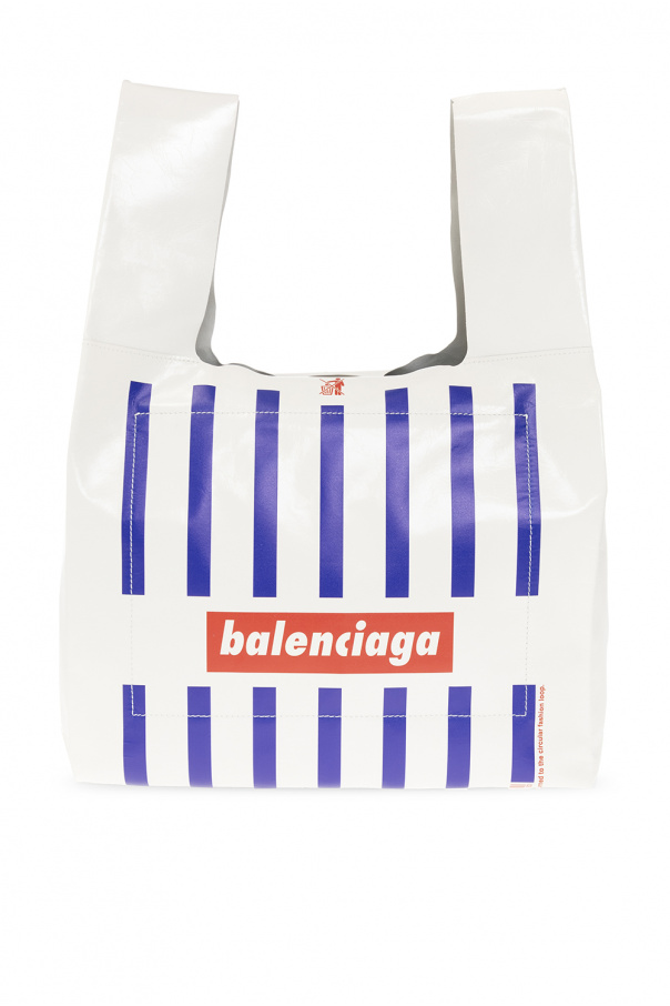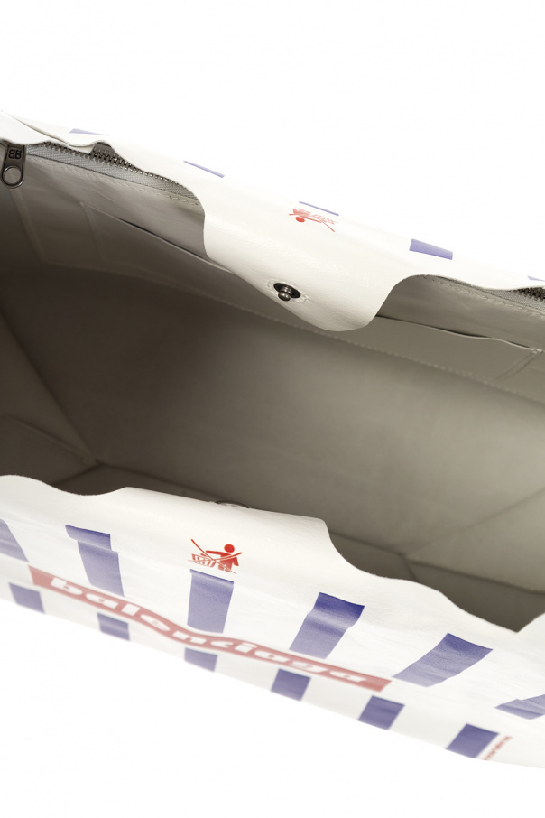 White ‘Monday’ shopper bag from Balenciaga. Made of calf leather, this model features a snap closure, navy and red logo pattern, two half-round handles, silver-tone metal hardware and one internal compartment with one zip pocket and one slip pocket.