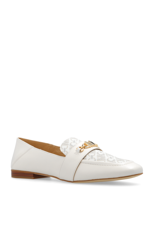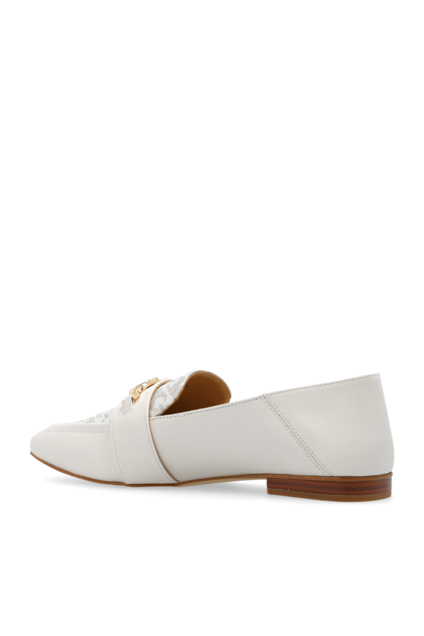 Cream ‘Tiffanie’ loafers from Michael Michael Kors. Made of leather and coated monogram canvas, this pair sits on a beige and brown rubber sole and is decorated with a logo detail in gold-tone metal.