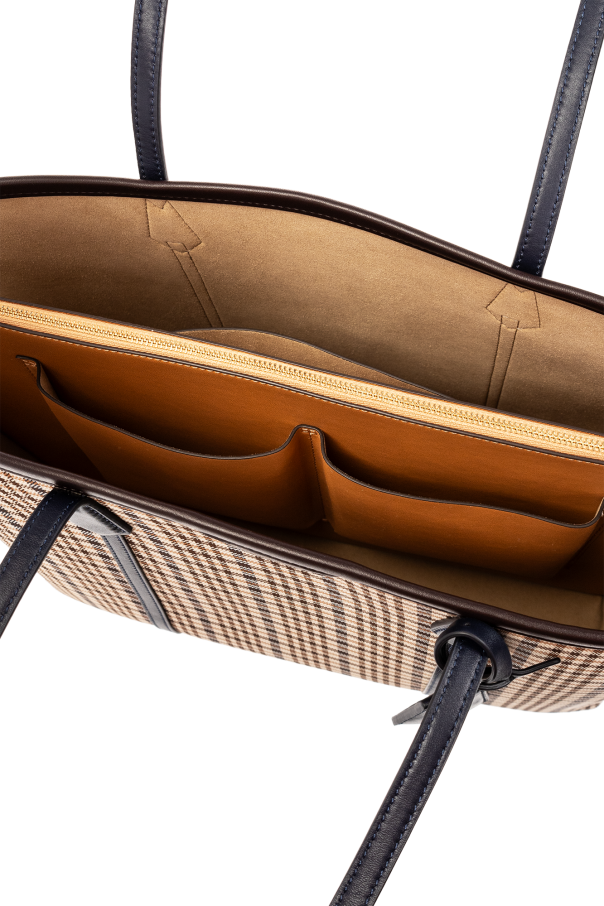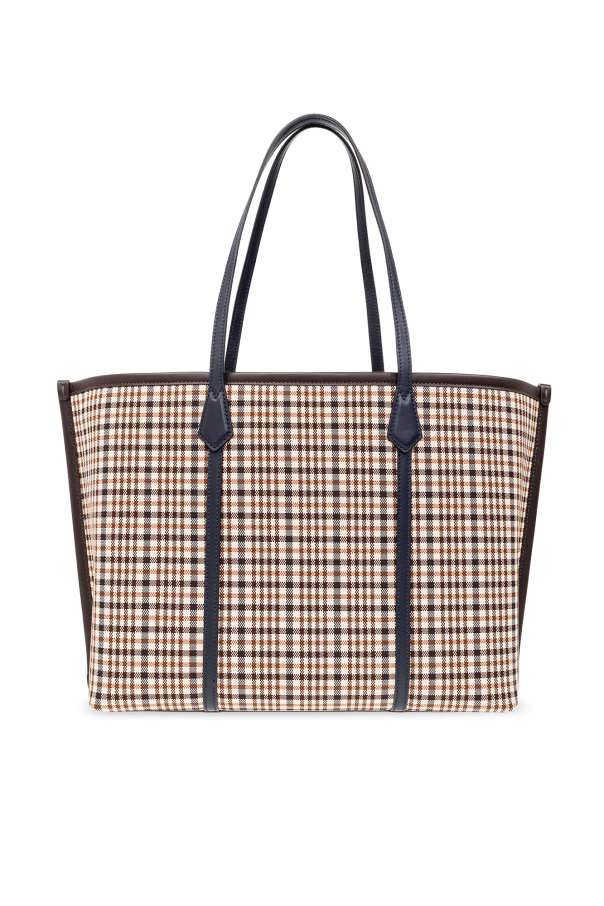 Brown, navy and beige ‘Perry Plaid’ shopper bag from Tory Burch. Decorated with a logo patch and check pattern, this design features two half-round handles, a detachable and adjustable shoulder strap, gold-tone metal hardware and one internal compartment with three slip pockets and one zip pocket.