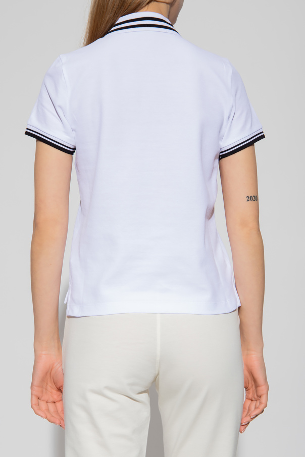White and black polo shirt from Moncler. Made of cotton, this garment features a buttoned collar, multicolored logo patch, side slits and short sleeves.