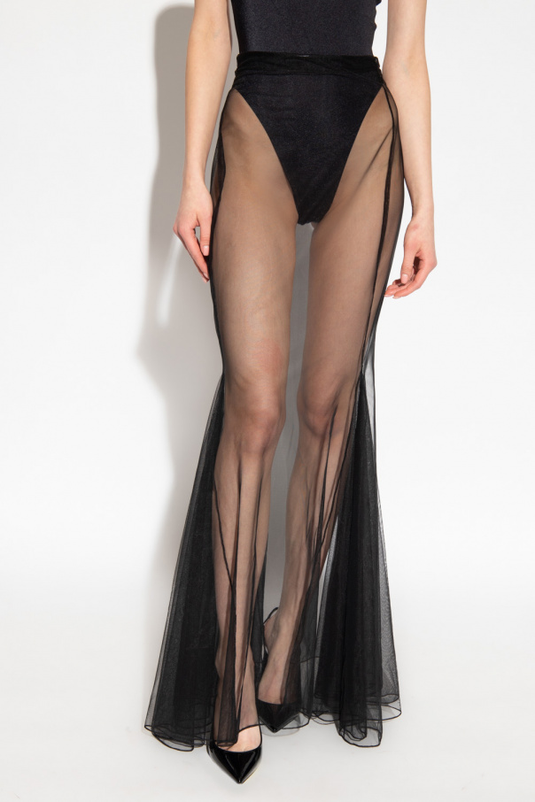 Black sheer skirt from Saint Laurent. Crafted from stretchy tulle, this design has a concealed side zip and hook fastening and fitted silhouette with godets.