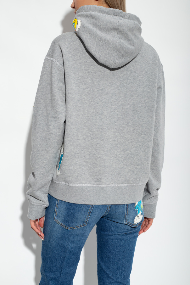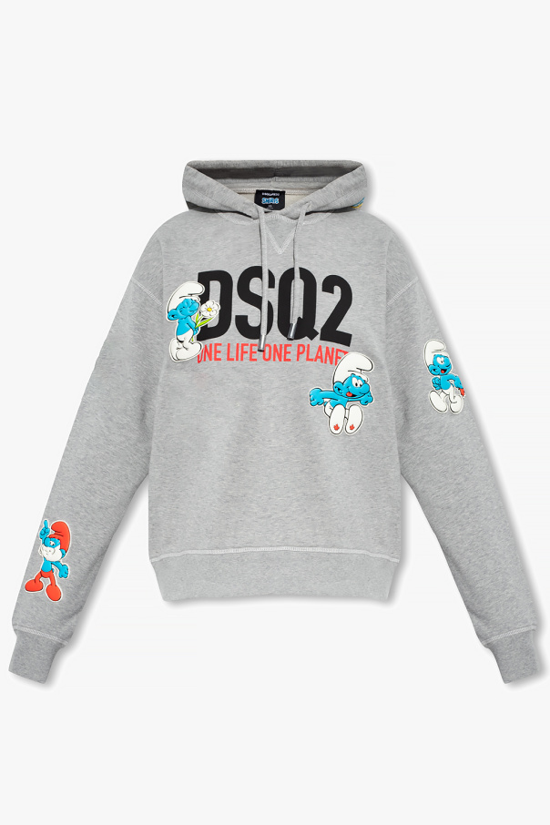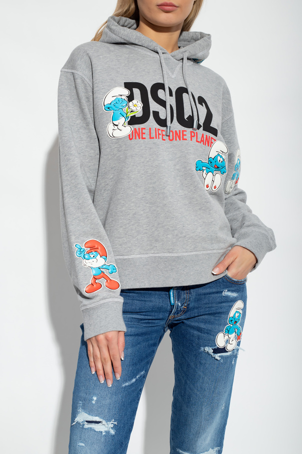Grey sweatshirt with a drawcord-adjustable hood from Dsquared2 x The Smurfs, the ‘One Life One Planet’ collection. Crafted from cotton jersey, this style showcases a colourful graphic print with a motif of ‘The Smurfs’ comic franchise, long sleeves and ribbed trims on the bottom hem and cuffs.