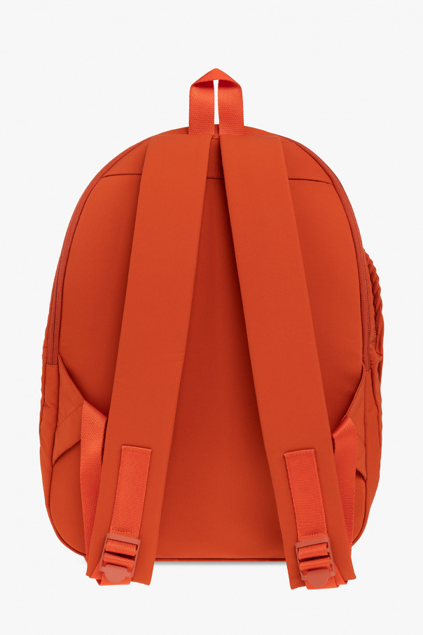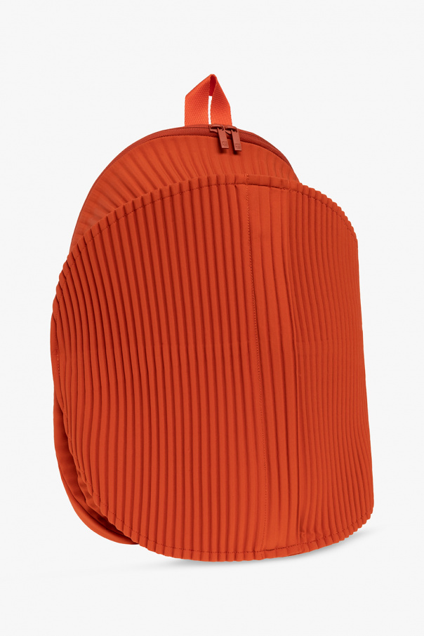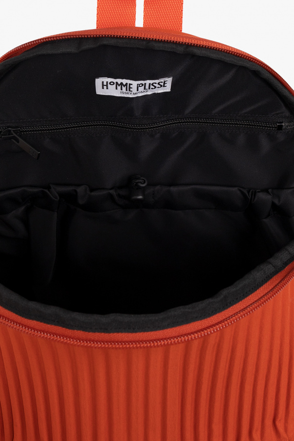 Orange backpack from Issey Miyake Homme Plisse. Distinguished by pleats, this design features a two-way zip fastening, a zip front pocket, a half-round handle, adjustable straps and one internal compartment with one zip pocket and one drawstring-cinched pocket.