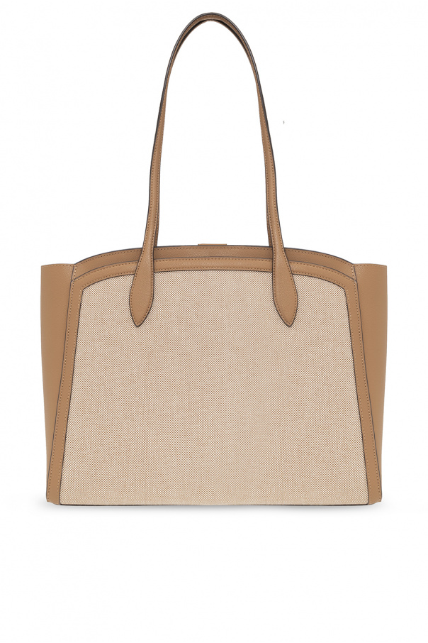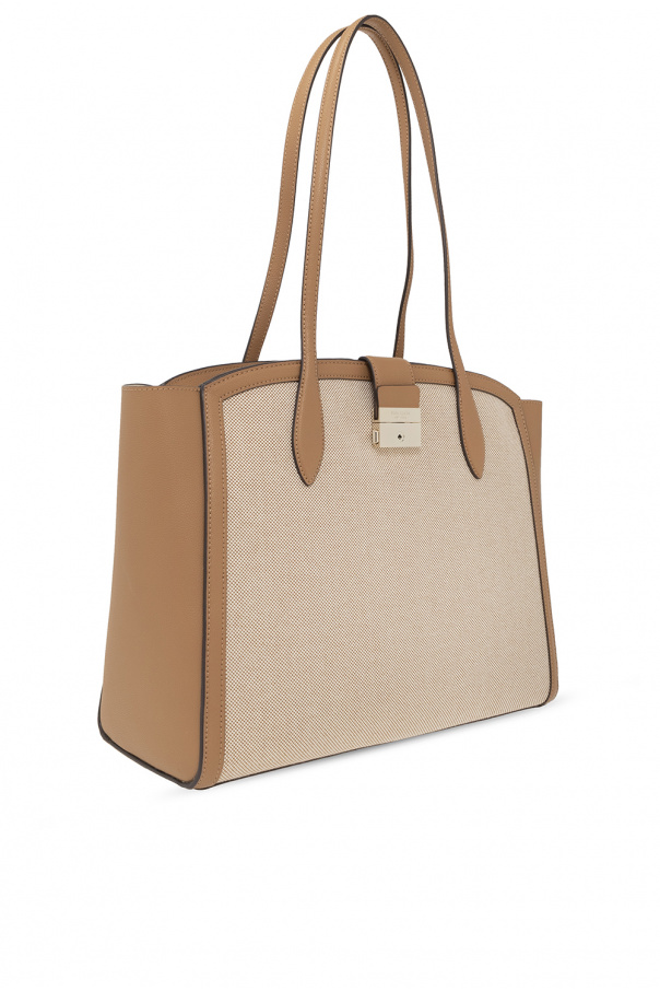 Brown and beige ‘Voyage Large’ shopper bag from Kate Spade. Crafted from fabric and leather, this design fastens via a zip and features a snap-fastened pocket and an engraved logo on the front, a back slip pocket, two half-round handles, light gold-tone metal hardware and one internal compartment with one snap-fastened pocket and six slip pockets.