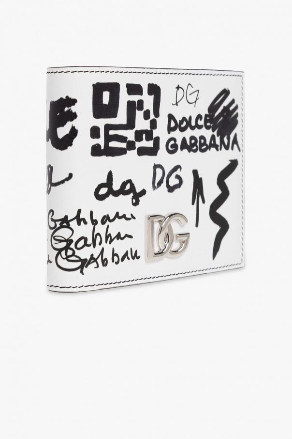 White folding wallet from Dolce & Gabbana. Crafted from calf leather, this design features a black graphic print, a silver-tone logo plaque on the front and one bill compartment, two slip pockets and six card slots inside.