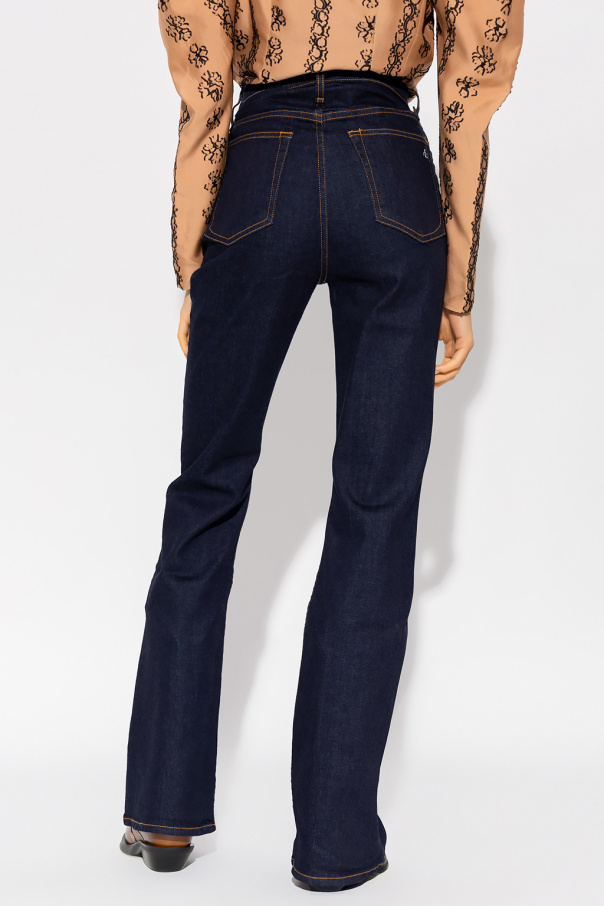Navy blue jeans from Rag & Bone. Falling with flared legs, this pair features a high-rise waist, a zip fly with a button, classic five pockets, beige stitching details and logo embroidery at the back.