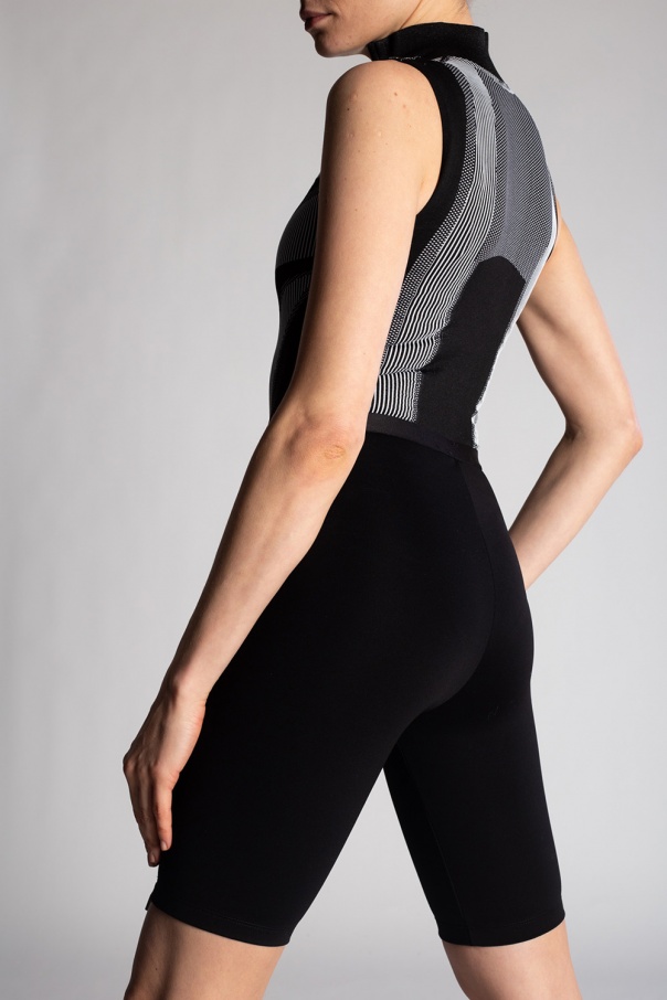 Black and white ‘Sport Active’ body from MISBHV. Crafted from breathable thermo-active fabric. 60% of the yarn is recycled. The garment features a white logo detail, mock neck as well as zip and hook & eye fastenings. This product was made in Poland with the use of 100% energy from solar panels.
