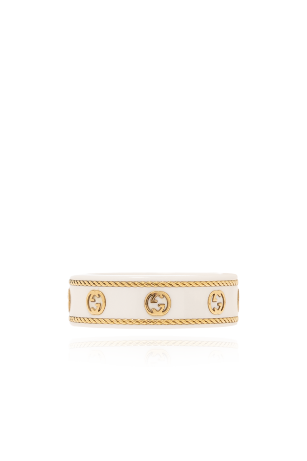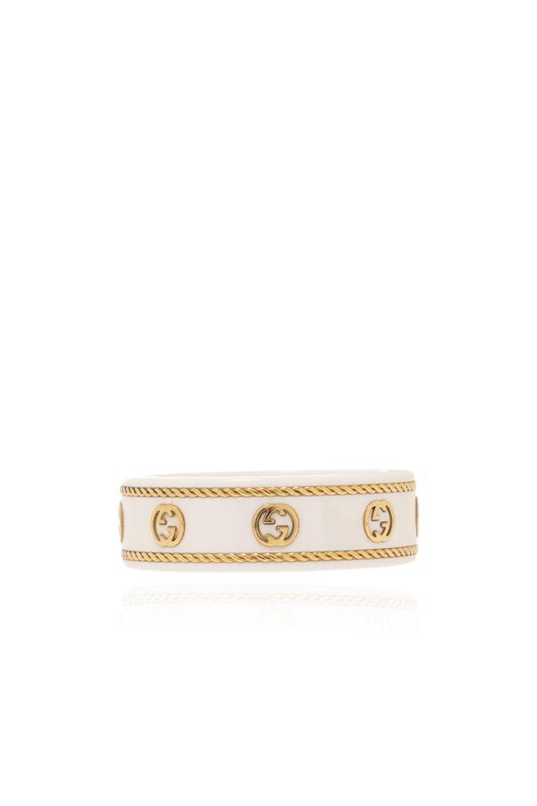 White ring from Gucci. Crafted from cubic zirconia with 18k yellow gold trim, this item features the brand's signature ‘Interlocking G’ logo detailing.