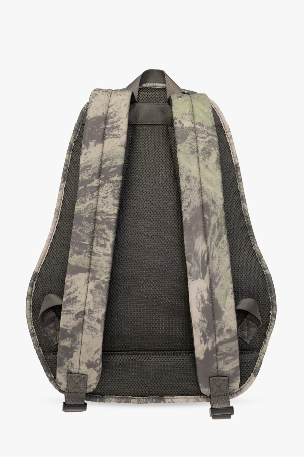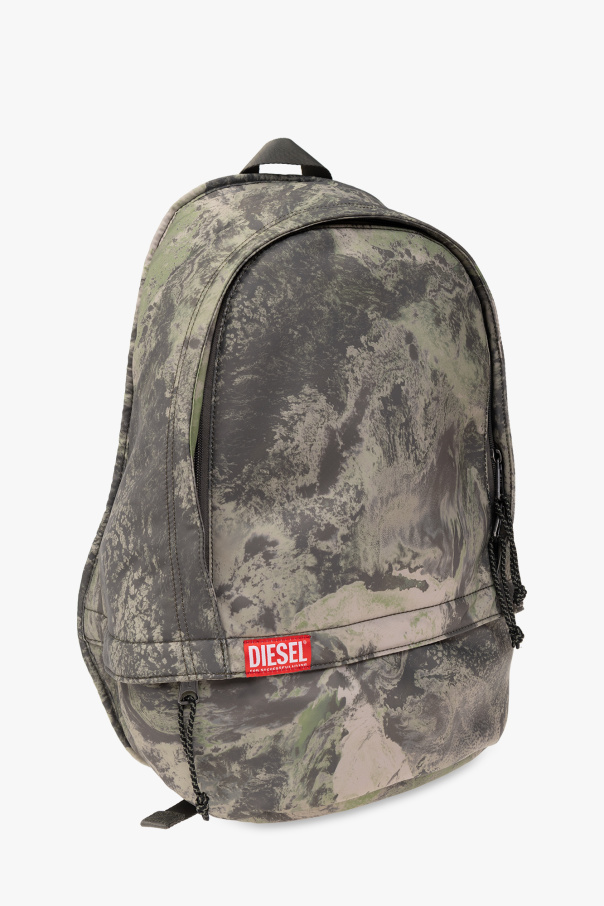 Green ‘RAVE’ backpack from Diesel. Fastened with a two-way zip, this model is decorated with a pattern and complete with a zipped front pocket, logo patch, half-round handle, adjustable shoulder straps, antique silver-tone metal hardware and one internal compartment with one slip pocket and velcro tab fastening.