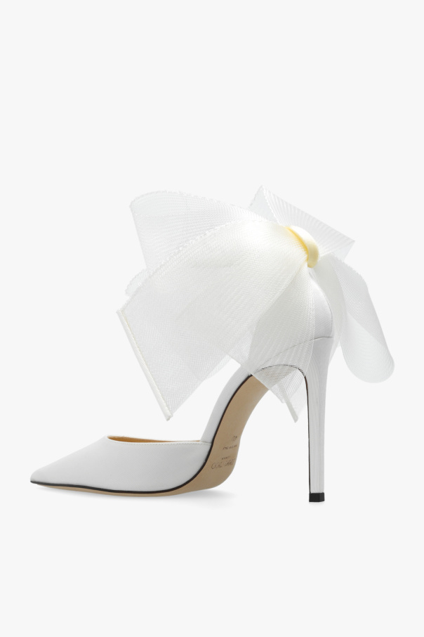 White ‘Averly’ pumps from Jimmy Choo. Crafted with a pointed toe silhouette, this model sits on a beige leather sole and showcases an adjustable ankle strap with a buckle and asymmetrically placed woven tulle bows.