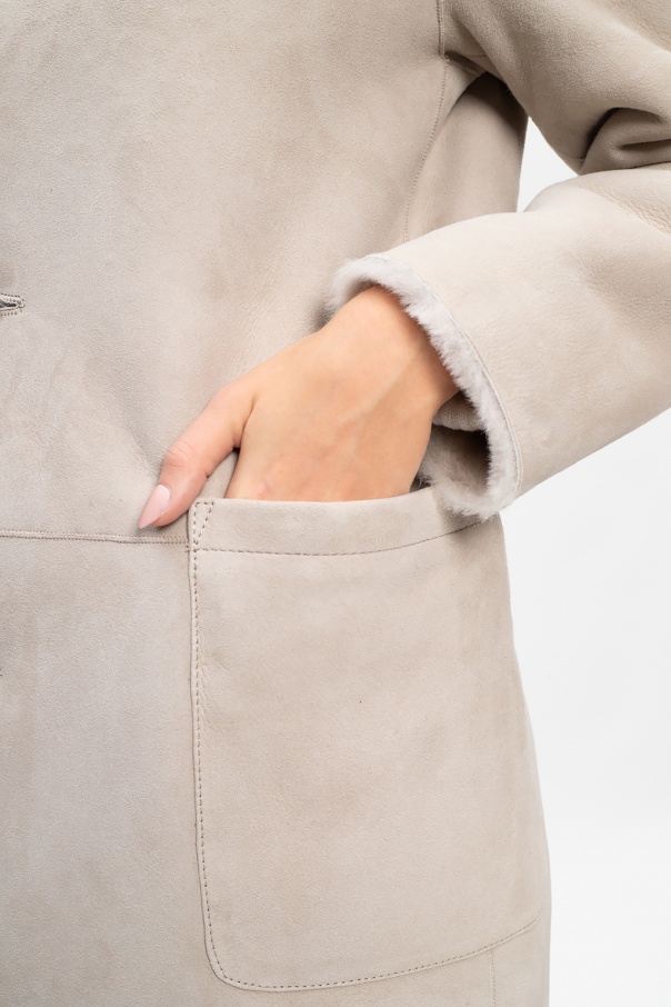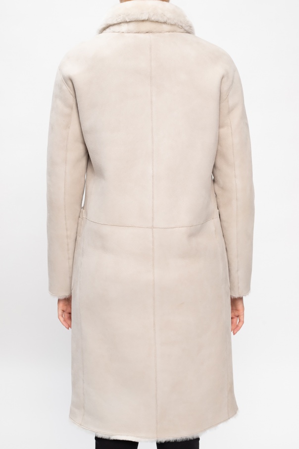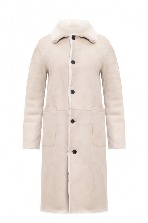 Cream and white 'Serra' jacket from AllSaints. Crafted from sheepskin and shearling, this design fastens via buttons and employs a classic wide-spread collar and two side pockets.