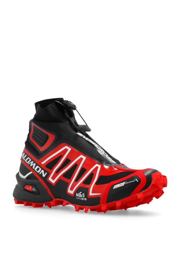Black and red ‘Snowcross’ high-top sneakers from Salomon. Made from fabric and synthetic material with a slip-on silhouette, this model sits on a black and red rubber sole equipped with Contagrip system to ensure superb traction and showcases a stitching pattern of the stiffening cage and the brand's logo.