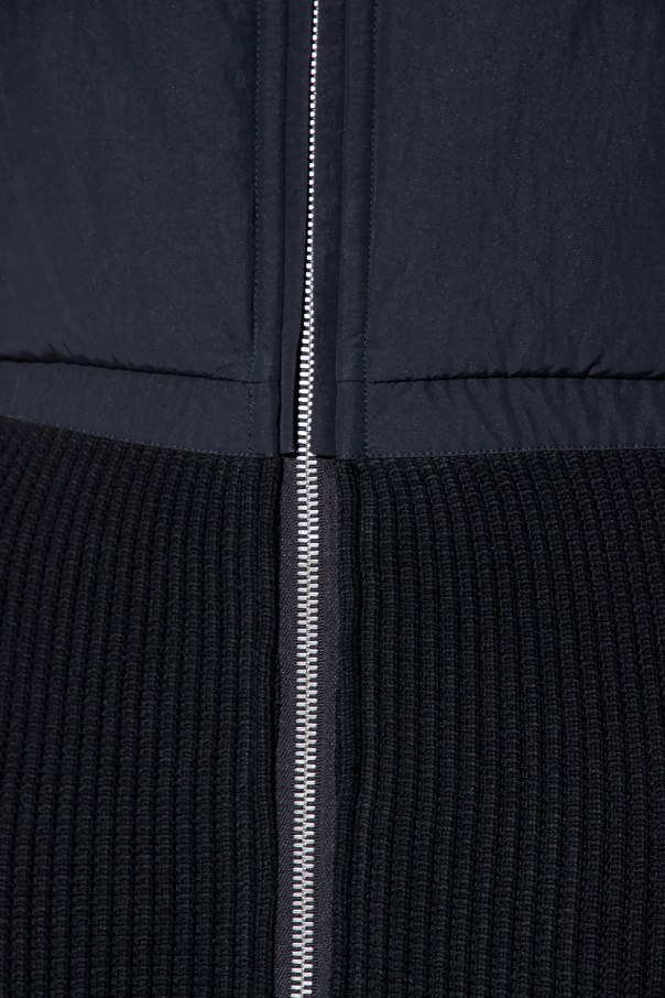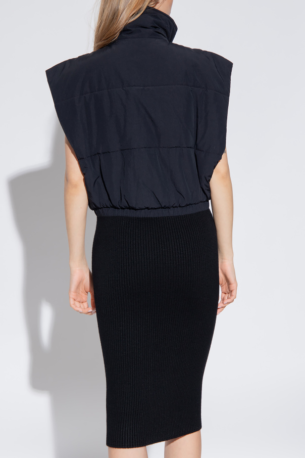 Long, black vest from Alaia. Crafted from contrasting fabrics, this design fastens with a two-way zip.