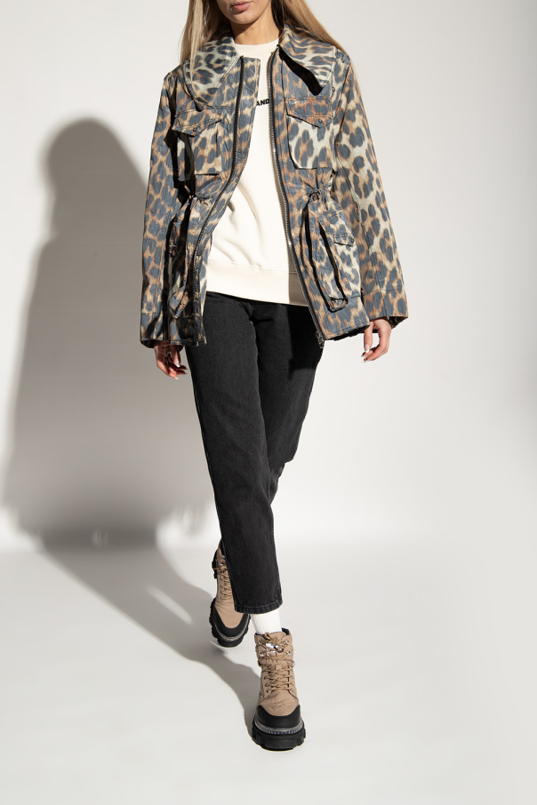 Beige and black hiking boots from Ganni. Made of fabric with leather trims, this lace-up pair features logo details and chunky sole in black rubber.