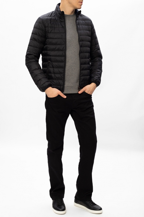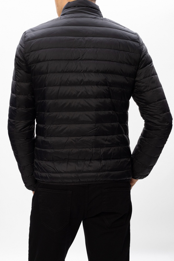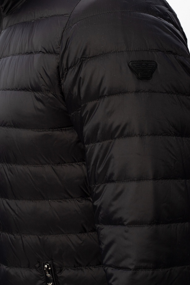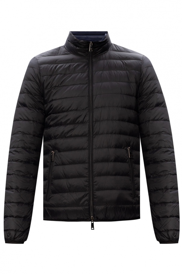Black and navy blue reversible jacket from Emporio Armani. Filled with a duck down, this style fastens via a two-way zip and showcases a logo print for the brand recognition. It comes with zipped and snap-fastened pockets, elasticated trims and a branded case.