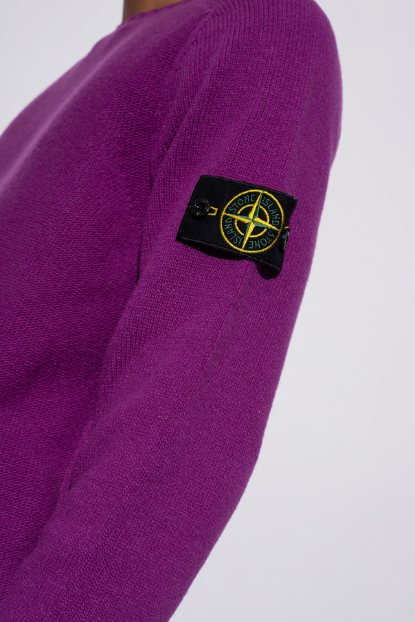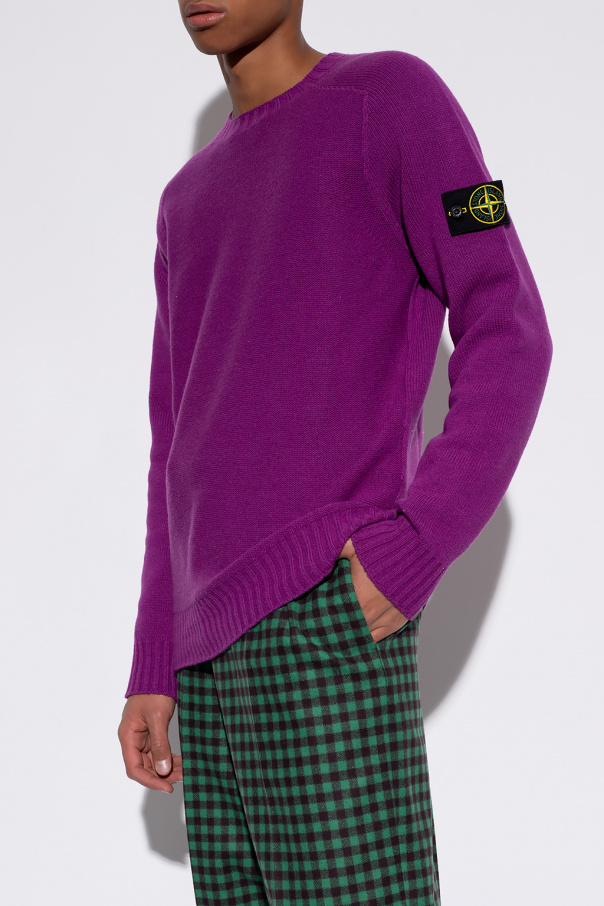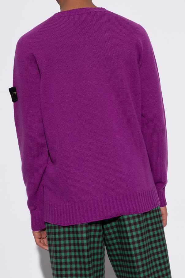 Purple crewneck sweater from Stone Island. Crafted from wool, this style showcases a black, green and yellow graphic with the label's logo and ribbed trims on the collar, bottom hem and cuffs.