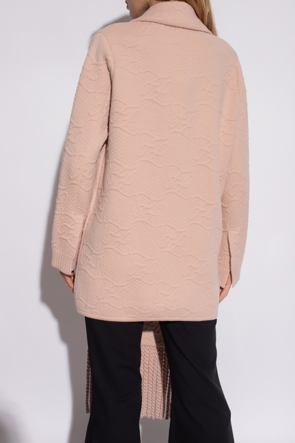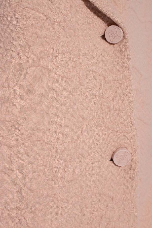 Blush pink double-breasted coat from Fendi. Cut with an asymmetrical silhouette, this item showcases a raised logo pattern. It is complete with button fastenings, peak lapels, two snap-fastened pockets on the front, ruffle detailing and long sleeves with vents.