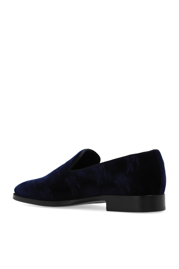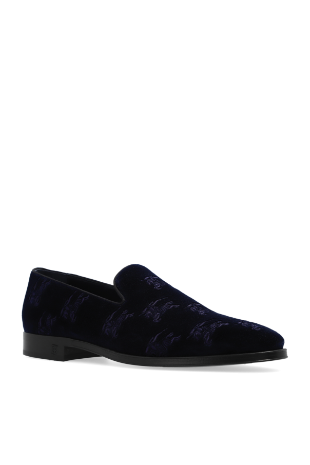 Navy blue ‘Wayne’ loafers from Burberry. Rendered in velvet fabric, this model sits on a black leather sole and showcases graphic embroidery with the brand's signature ‘Equestrian Knight’ motif.