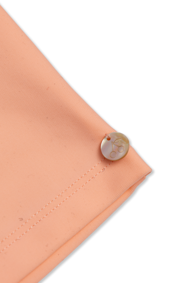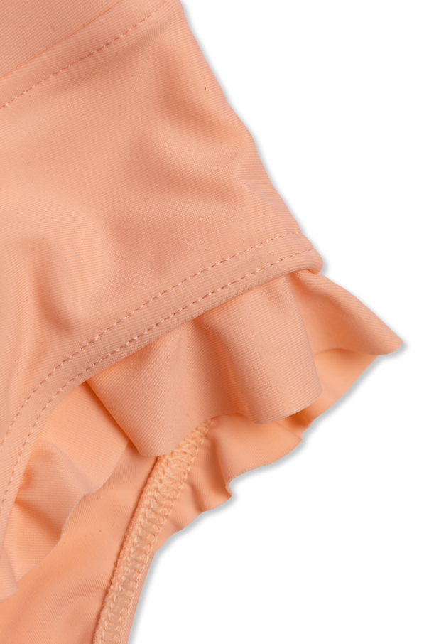 Pink ‘Ainoa’ two-piece swimsuit from Bonpoint. Embellished with a pearly logo pendant on the front, it includes ruffled bottoms and a top with a mock neck and long sleeves.