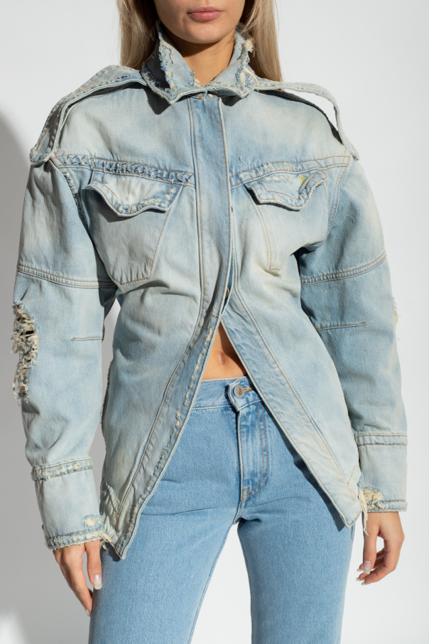 Blue ‘Pocket’ denim jacket from The Attico. Distinguished by a vintage effect, this style features button fastenings with a concealed placket, shoulder epaulettes, two flapped pockets with snaps – one is embroidered with a logo, two side welt pockets, an elongated front hem and long sleeves with button cuffs.